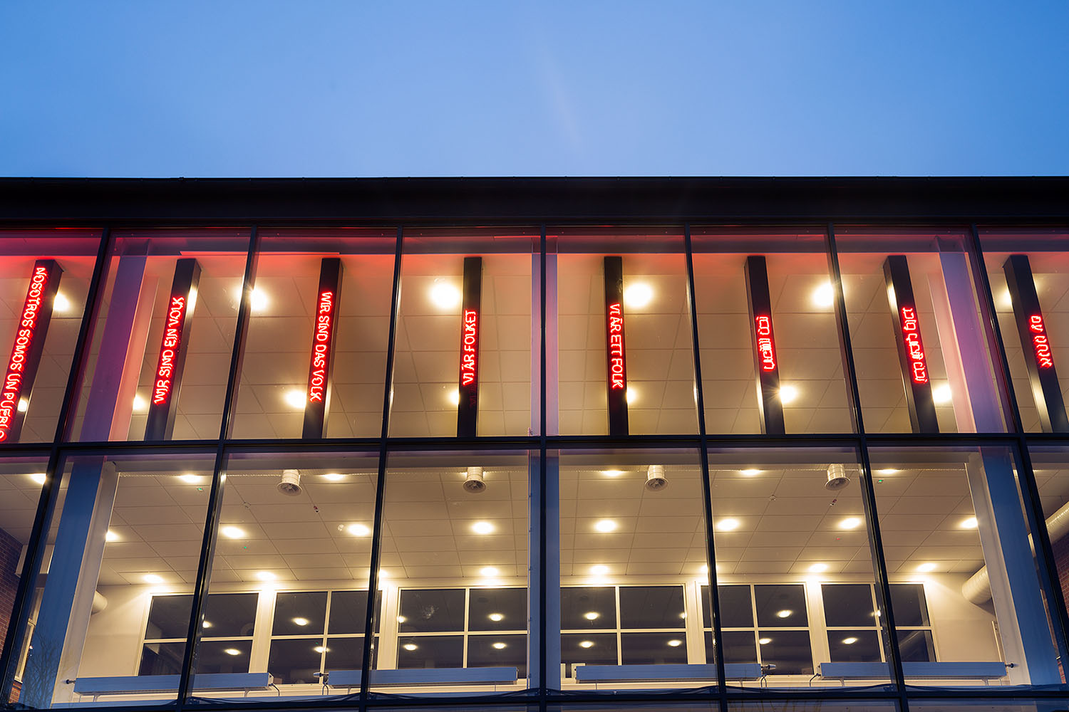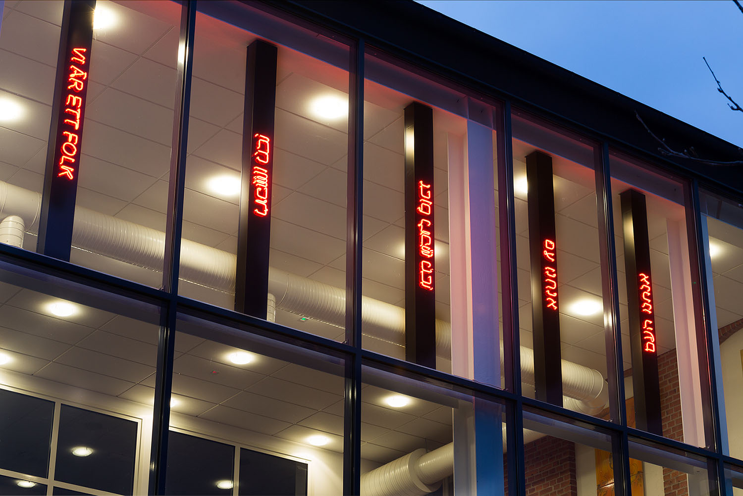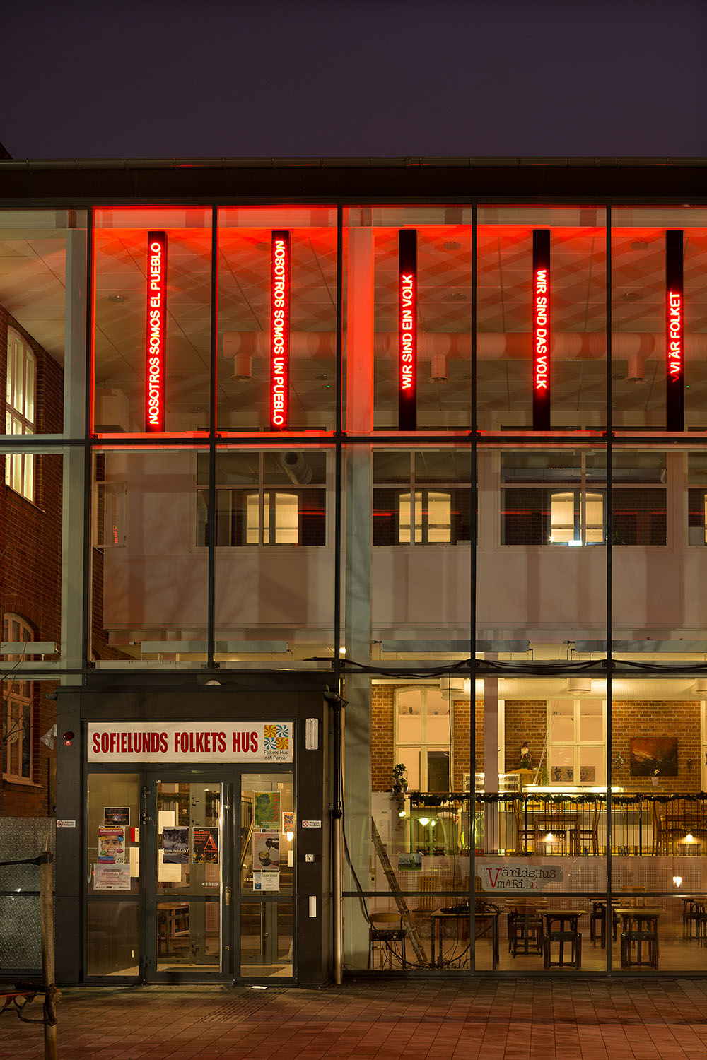 Verket består av tio röda neonskyltar som bildar texten ”VI ÄR FOLKET” och ”VI ÄR ETT FOLK” på svenska, samt översatt till tyska, spanska, arabiska och hebreiska.